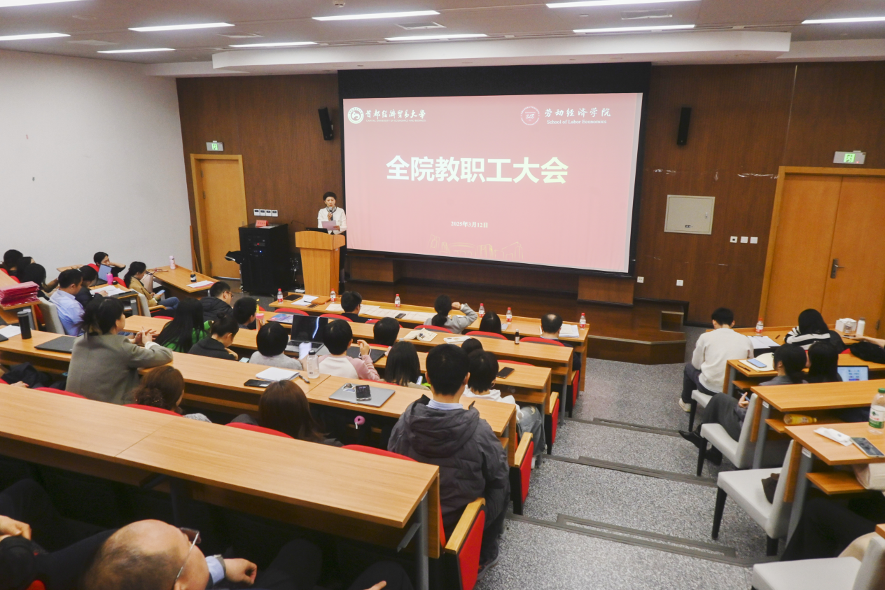 罗楚亮聚焦2025年学院发展核心任务做出系统部署和规划。他指出,学院要围绕学校所确定的发展目标,把握“双一流”建设扩围的战略契机,谋划高质量发展蓝图,推动应用经济学科实现新突破,推进专业数字化转型,应对招生规模扩大的挑战,筹备建院70周年系列活动。深入实施“琢玉工程”,优化人才培养方案;深入实施“登峰工程”,加强有组织科研并强化“劳动科学”与“人口科学”特色研究;深入实施“领雁工程”,打造高素质专业化教师队伍;深入实施“丝路工程”,开展国际交流合作。他还强调,学院需建立教学、科研“新常态”,营造常态化的学术氛围,全院师生勠力同心、乘势而上,推动学院发展再上新台阶。