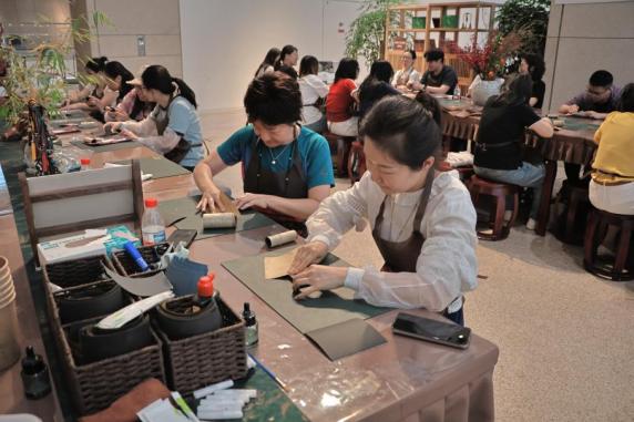 在中国工艺美术馆(中国非物质文化遗产馆),党员们亲手制作扬州漆器髹饰。扬州漆器为中国传统的特种工艺品,历史悠久,风格独特,现代扬州漆器制作工艺丰富,颇具东方神韵。党员们在工作人员指导下,打磨、铺胶、抛光。打磨木胎时的粗糙触感、调配生漆时的天然清香、镶嵌螺钿时的毫米级精度把控……髹饰的木纹光泽在无数次打磨中变得清晰明亮。通过亲手触摸千年技艺,大家沉浸式体验非遗手工技艺的独特魅力。