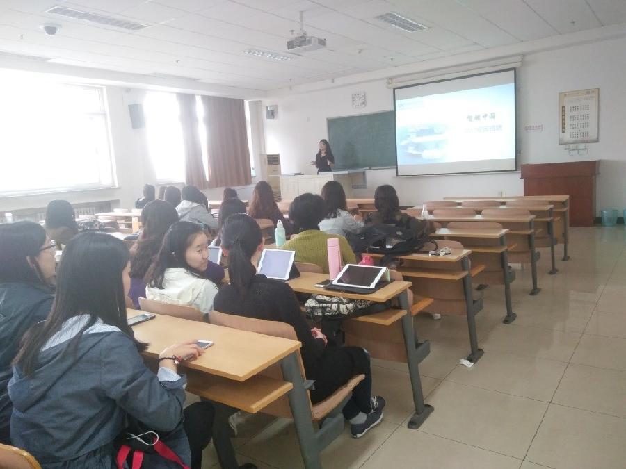 4月19日下午,金牛 学院邀请了中国国际技术智力合作公司外企服务公司(简称“中智”)人力资源部招聘主管韩怡然女士在博学楼706教室进行宣讲,其目的是为大三学生提供实习机会,到场学生半百人。