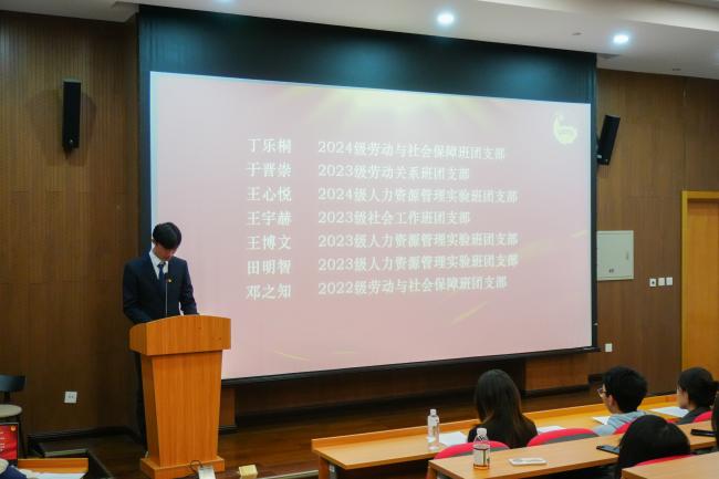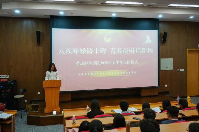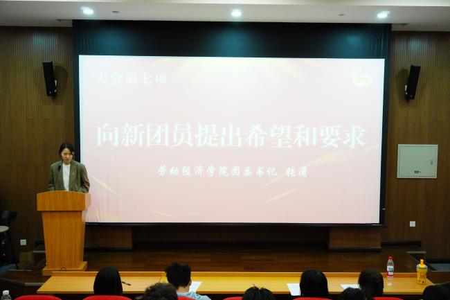 新团员代表、2024级劳动经济学班团支部施安琪发言。她分享了向团组织靠拢的成长历程,表达了成为团员的喜悦与自豪,并承诺将以“劳”为楫、以“经”为帆,在学习中锤炼本领,在实践中勇担使命,用青春行动回应时代召唤。