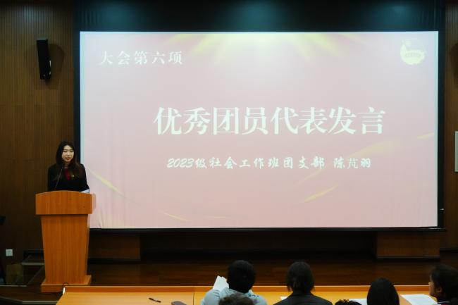 优秀团员代表、2023级社会工作班团支部陈芃羽发言。她结合自身经历,阐释了团员的责任与担当,同时号召新团员们传承红色基因,延续奋斗精神,在民族复兴的征程中并肩前行,共同书写青春华章。