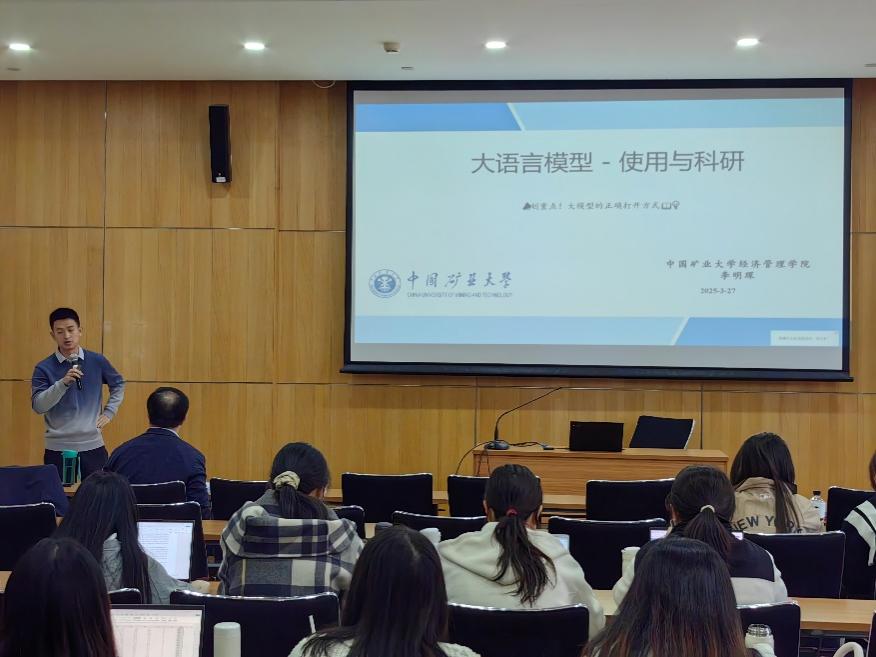 3月27日下午,金牛论坛 在博远楼4号报告厅举办“大语言模型助力科研论文与项目撰写”讲座。特邀中国矿业大学经济管理学院李明琛副教授担任主讲人,金牛论坛 党委书记何勤教授、副院长苗仁涛教授,多位教师和硕士、博士研究生参会。讲座由苗仁涛主持。