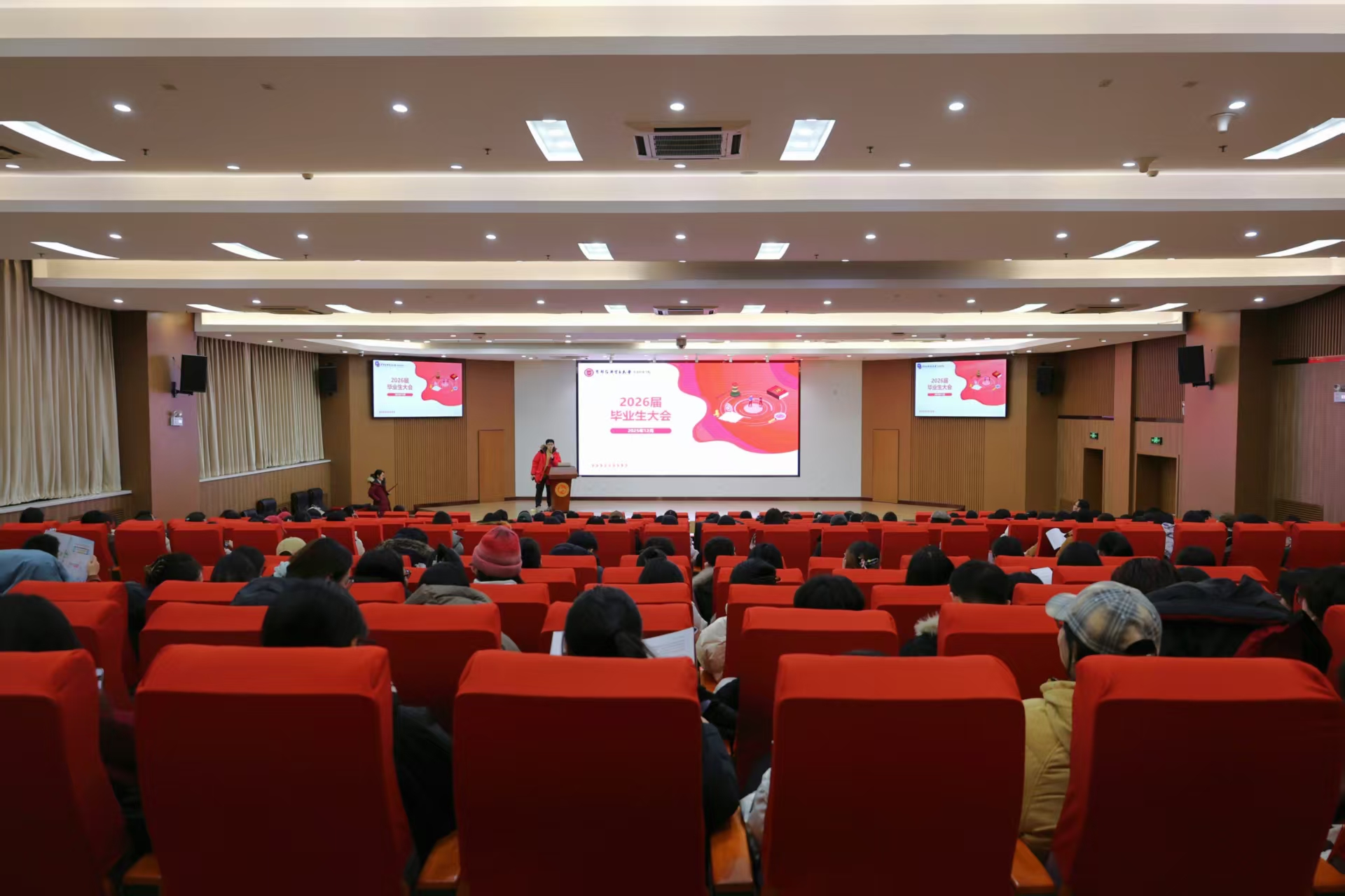 为精准把握就业新趋势,助力2026届毕业生顺利启航,12月23日,金牛论坛 召开2026届毕业生大会。学院党委副书记柳艺、本科生教学秘书陶政宇、研究生教学秘书苏静、团委书记张潇及全体毕业生参会,会议由学院专职辅导员沙思廷主持。