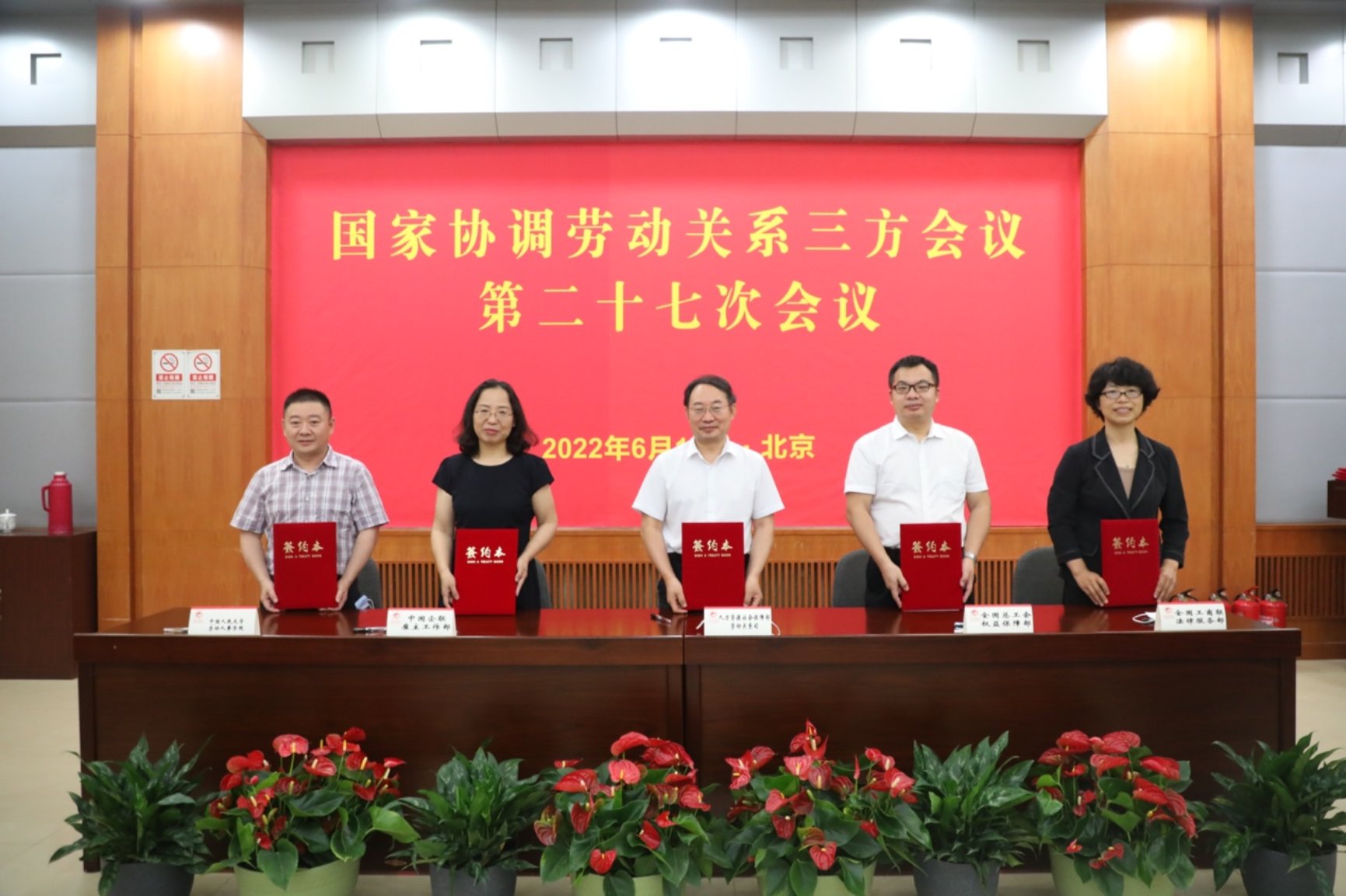 2022年6月17日,国家协调劳动关系三方会议第二十七次会议在北京召开。人力资源社会保障部、全国总工会、中国企联、全国工商联相关领导和有关负责人出席会议并讲话。会议审议通过《新时代和谐劳动关系创新研究基地战略合作协议》、《国家协调劳动关系三方会议专家委员会组建方案》,并举行了战略合作协议签字仪式。