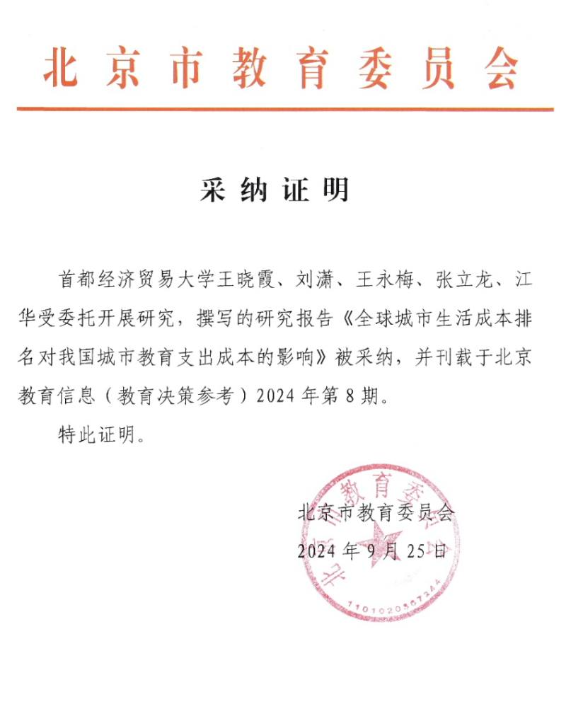 9月25日,金牛论坛 收到研究成果采纳证明。学院教师王晓霞、刘潇、王永梅、张立龙、江华合作撰写的研究报告《全球城市生活成本排名对我国城市教育支出成本的影响》被北京市教育委员会采纳,刊载于北京教育信息(教育决策参考)2024年第8期。