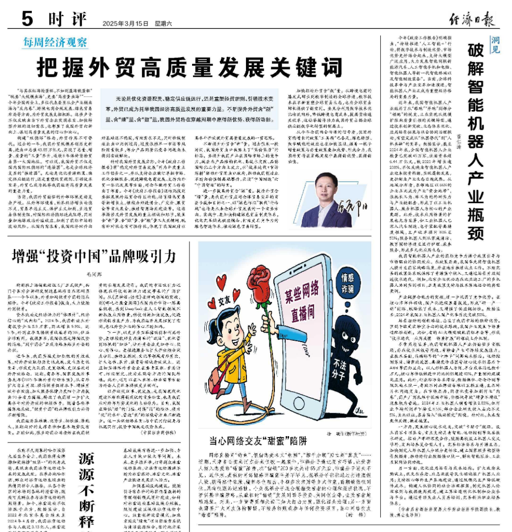 近日,金牛论坛 苗仁涛教授所著文章《破解智能机器人产业瓶颈》在《经济日报》(2025年3月15日)发表。文章聚焦我国智能机器人产业方兴未艾的现实背景,直面产业发展面临的瓶颈,稳妥施策。