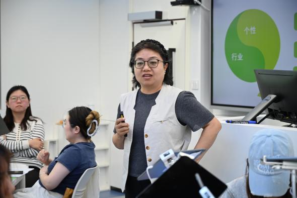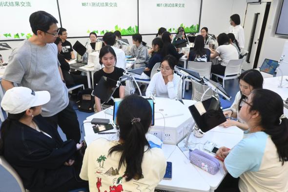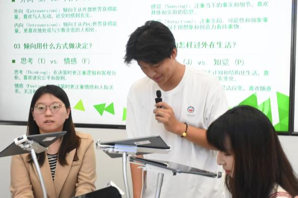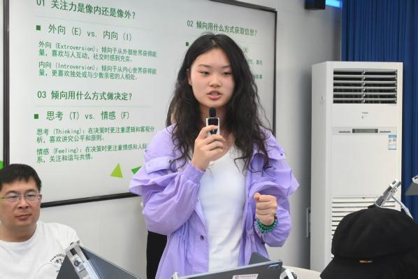 第一阶段课程聚焦 “向内自我认知”,由刘宁老师主持。课堂初始,马力群老师借助 MBTI 性格测评工具,解析不同性格的核心优势与职场提升路径,引导学生科学理解性格特质与职业发展的适配性。安斌老师带来 “人物画像速写” 教学,通过案例演示精准捕捉职业特征的技巧,帮助学生构建清晰职业形象认知。理论教学后,课程组织分组职场场景模拟实战,导师结合测评结果与现场表现进行一对一精准点评,推动自我认知理论转化为可操作的职业发展指导方案,提升学生实践能力。
