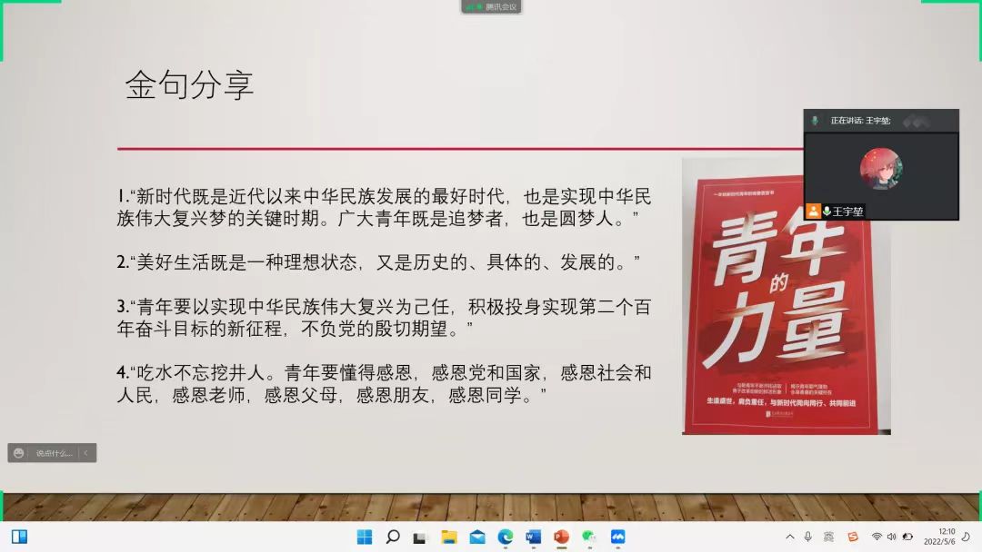 20级金牛 5班团支部也在读书会上分享了王建敏编著的《青年的力量》。书中对五四精神进行了阐释,号召广大青年秉承五四精神,树立远大理想,热爱伟大祖国,担当时代责任,勇于砥砺奋斗,练就过硬本领,锤炼品德修为。