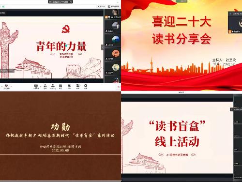 喜迎二十大,永远跟党走,奋进新征程。在建团100周年之际,为提升团员青年的思想水平,展现基层团支部的精神风貌,鼓励团员青年学习习近平总书记在人民大学考察时的重要讲话精神,体会总书记对新时代中国青年寄予的殷切期望和提出的明确要求,金牛论坛 分团委组织“扬帆起航争朝夕,砥砺奋进新时代”读书盲盒主题团日活动,为各支部寄送红色学习书籍相互传阅分享。各班团支书带领团员青年们在线上热情讨论,感悟青年责任,树立远大理想,坚定跟党走。