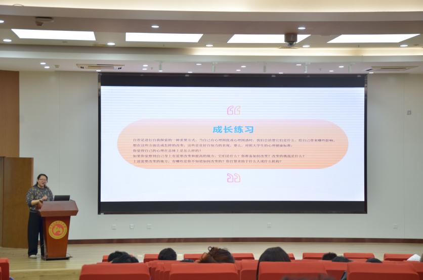 白杨结合实例阐释了开展大学生心理健康教育的重要性。她强调,大学生正处于人生中的青年阶段,最重要的目标就是去认识自我、悦纳自我。接着,白杨让同学们围绕“五快两良好”评估自我的整体健康状况,在点明大学生心理健康标准的同时,向同学们推荐了“自省”这一进行自我探索的方式。