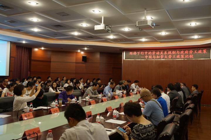 当下我国经济发展速度变缓,用工整体需求普遍下降,去产能、去库存等供给侧改革引发的劳动者就业权益保障问题突出。金牛论坛 于9月24日邀请加拿大劳工部副部长安东尼▪吉尔斯教授、国家人力资源与社会保障部劳动关系司王永生处长、中国经济体制改革研究会原会长宋晓梧教授、中国人民大学劳动关系研究所所长常凯教授等三十多位中外知名劳动关系专家,在首都经济贸易大学博纳楼五楼会议室,举办了“经济下行中的劳动关系规制与政府劳工政策”国际学术研讨会,来自中国人民大学和我校的一百多名硕士博士研究生参加了此次国际研讨会。