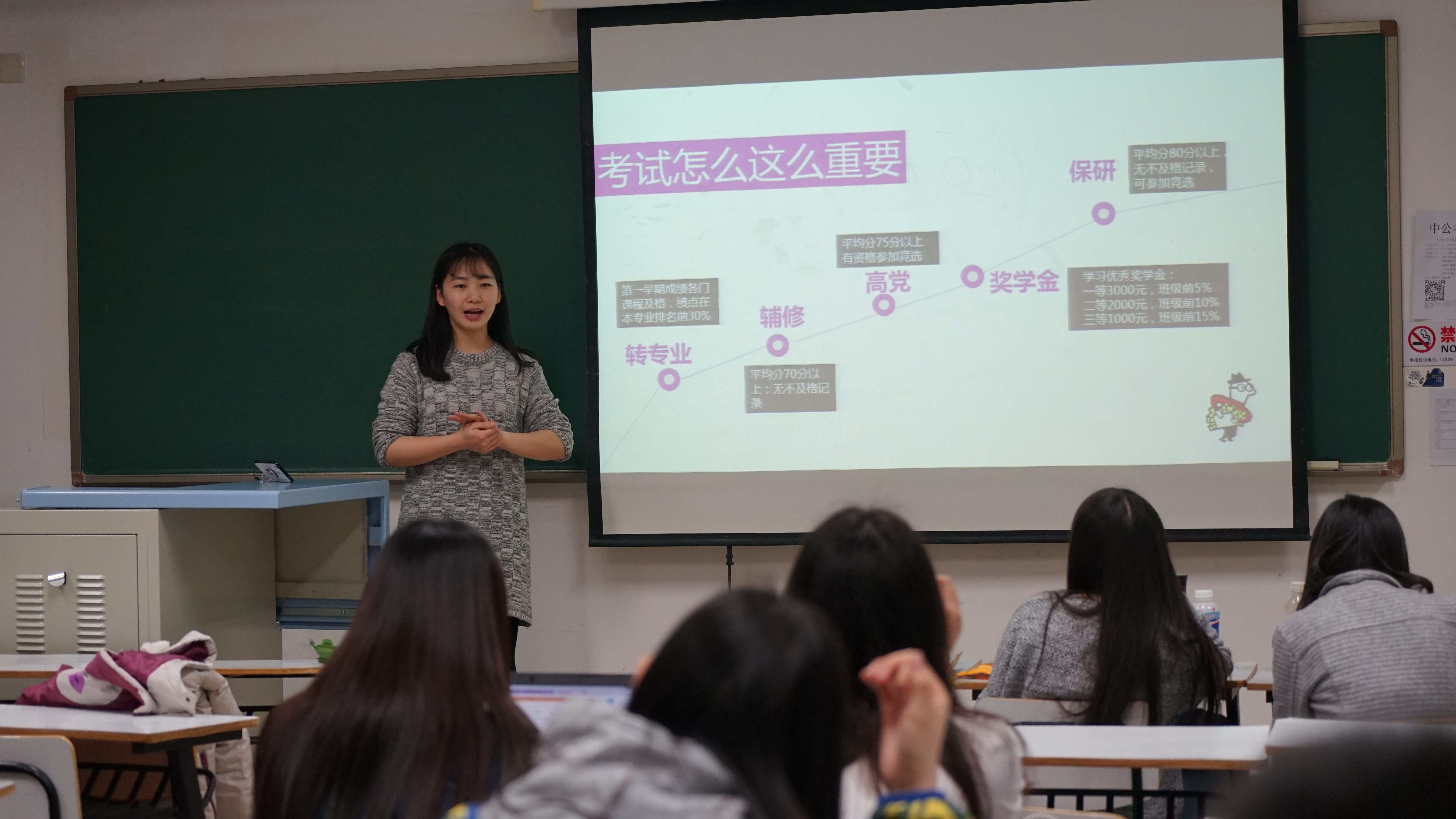首先,主讲人员向学生们讲解了考试的重要性,以及所涉及到的转专业、考研、奖学金等相关方面的讲解,使同学们对于考试的重要性有了更为深入的了解。接着,主讲人员向同学们分享各科考试的复习方法与建议。针对不同科目分别进行详细的讲解,将各科的备考小技巧传授给大家。并嘱咐在场的各位同学要认真听讲,平时要多做习题,注重课上与老师的互动。最后,主讲人员也向同学们展示分享了事先从学长学姐们那里讨教到的学习经验以及对大学生活的感悟和认知。同学们表示各有收获,受益匪浅。